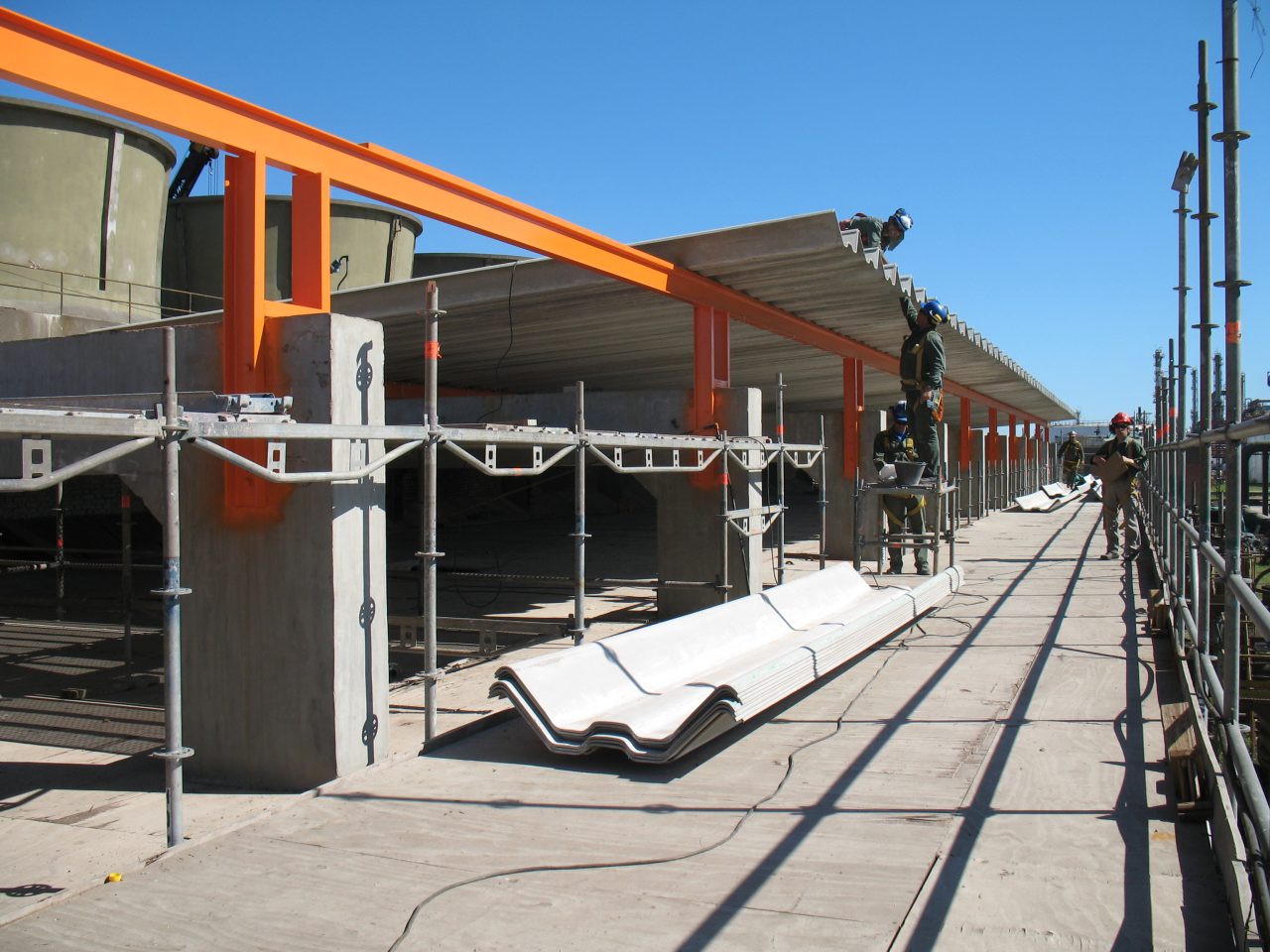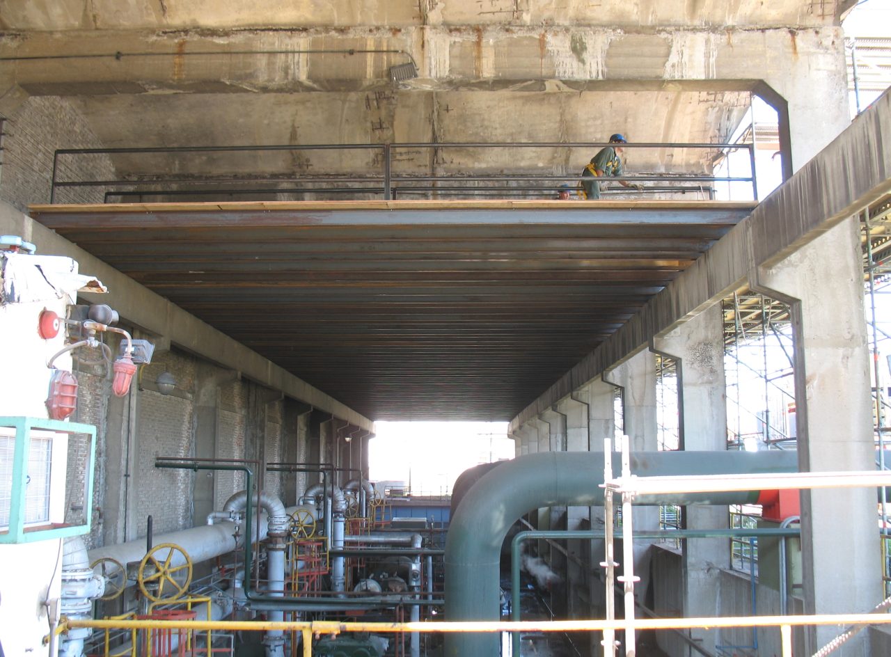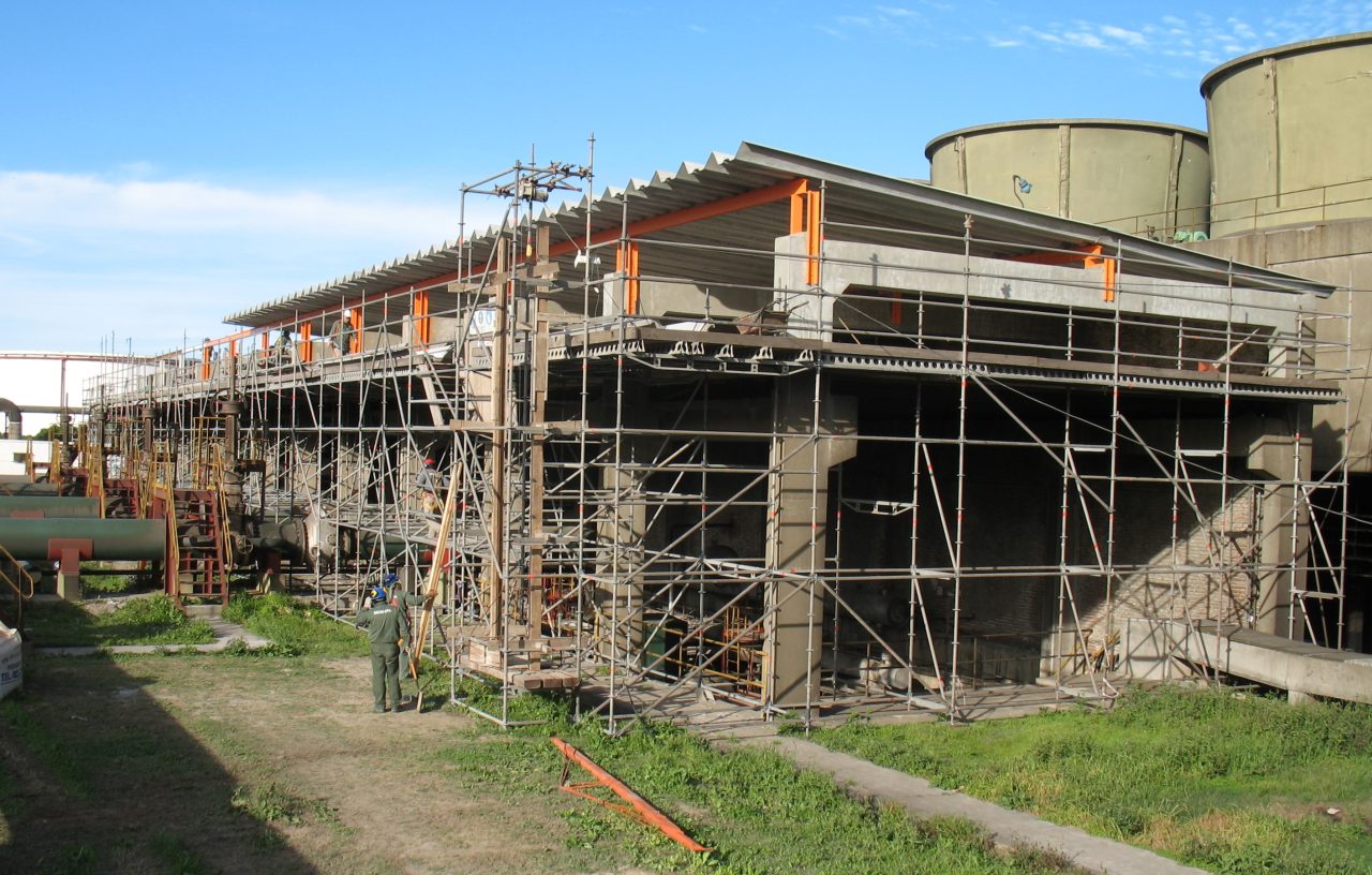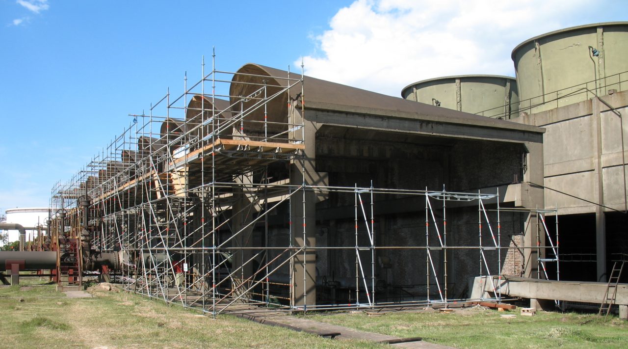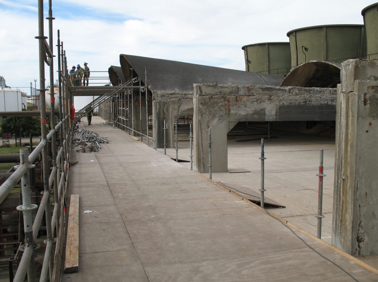 Apuntalamiento de 11 cáscaras de HºAº de 6 m x 11 m cada una, en peligro de colapsar. Montaje de plataforma protectora de 900 m² con perfiles doble T y paneles fenólicos.