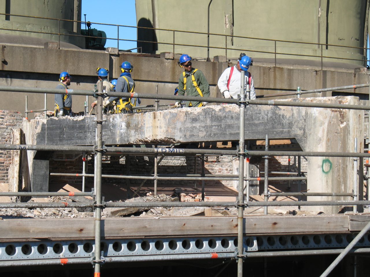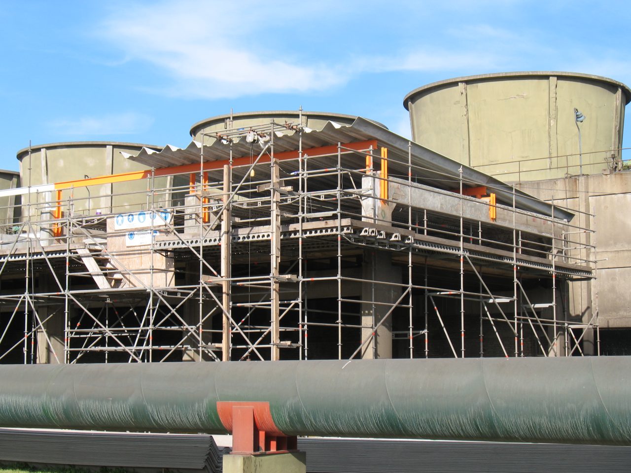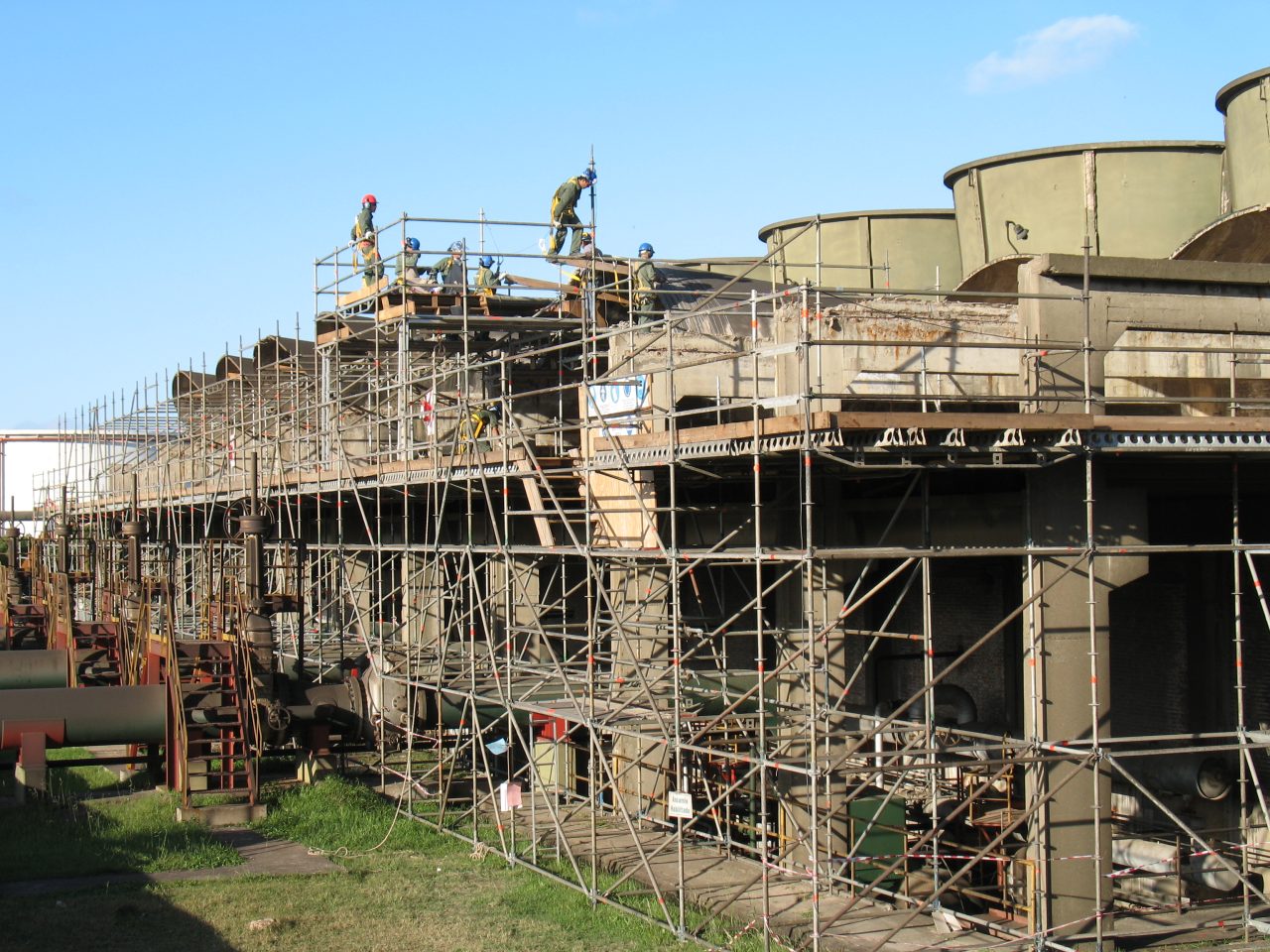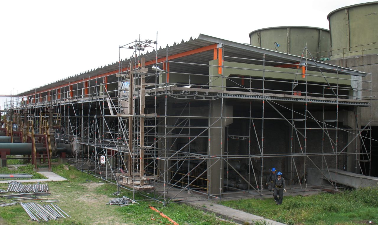 Apuntalamiento de 11 cáscaras de HºAº de 6 m x 11 m cada una, en peligro de colapsar. Montaje de plataforma protectora de 900 m² con perfiles doble T y paneles fenólicos.