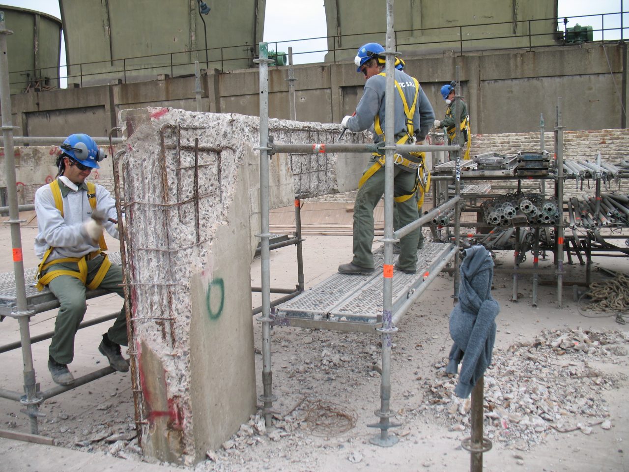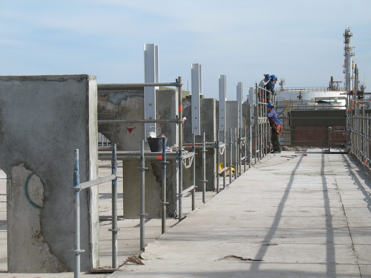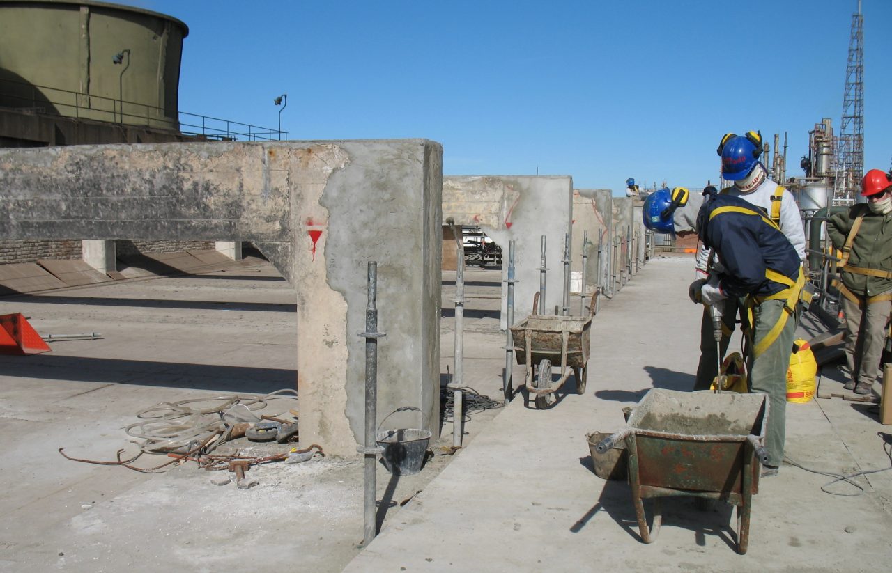 Reparación estructural de las dos vigas carrileras de HªAº de 70 m de longitud, sección 40 cm x 90 cm en Torres Hammon II en Refinería La Plata. Estas vigas se encontraban seriamente deterioradas por las agresiones químicas del ambiente y fueron recuperadas por medio de la reparación y pasivasión de sus armaduras y reconstitución de su sección con materiales especiales de SIKA.