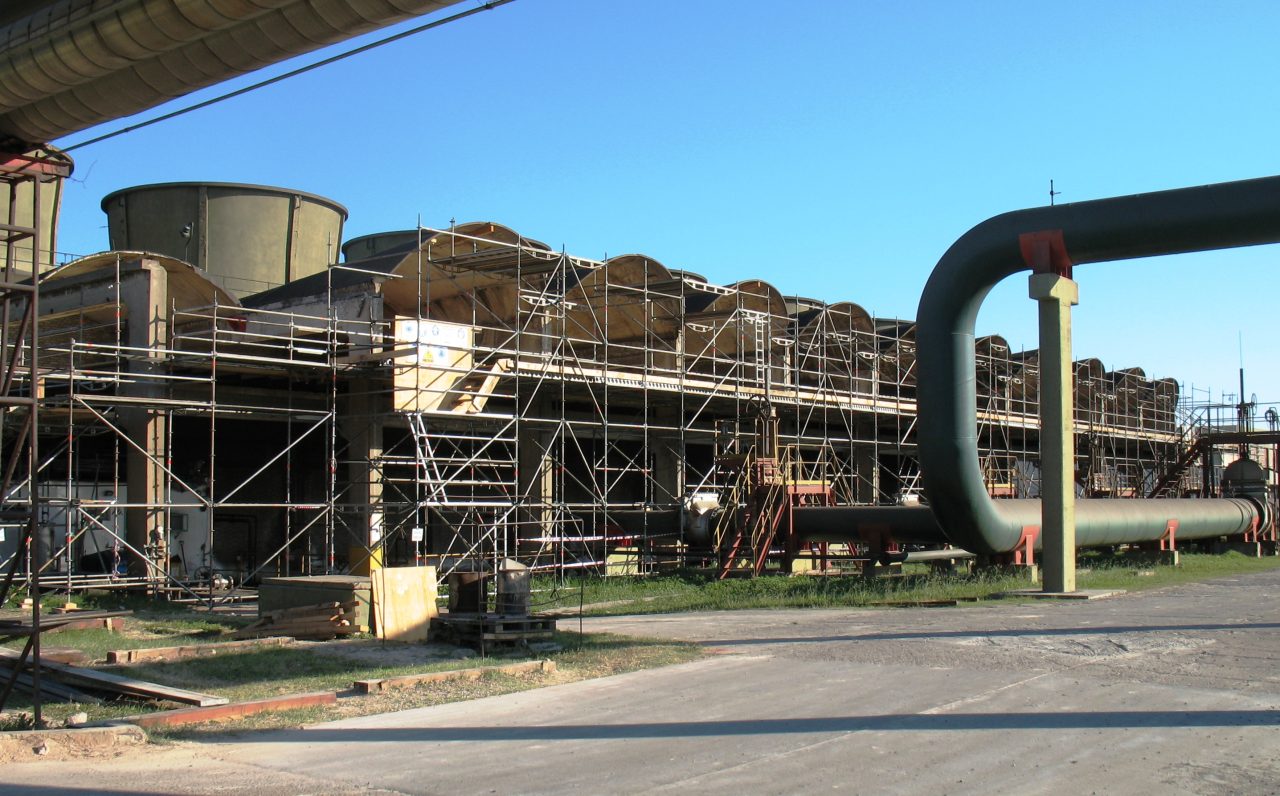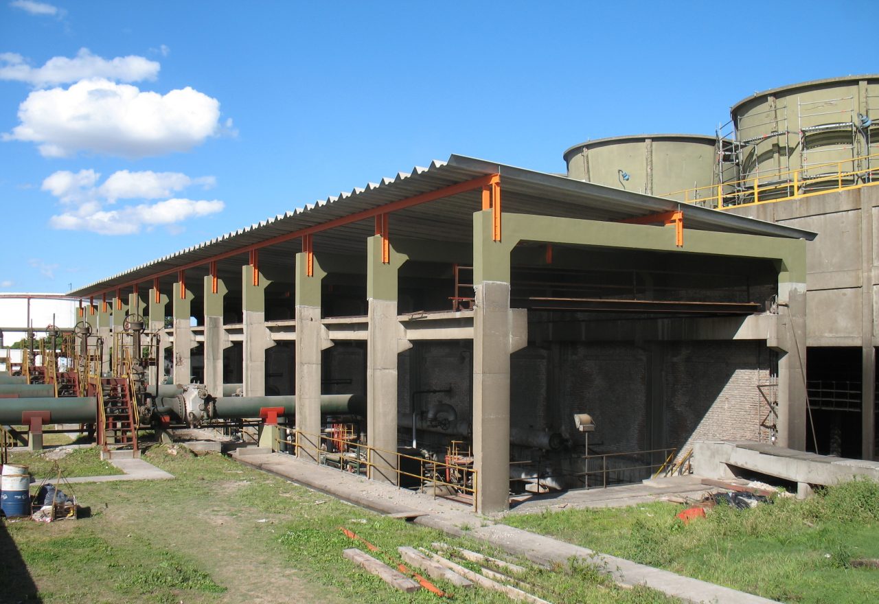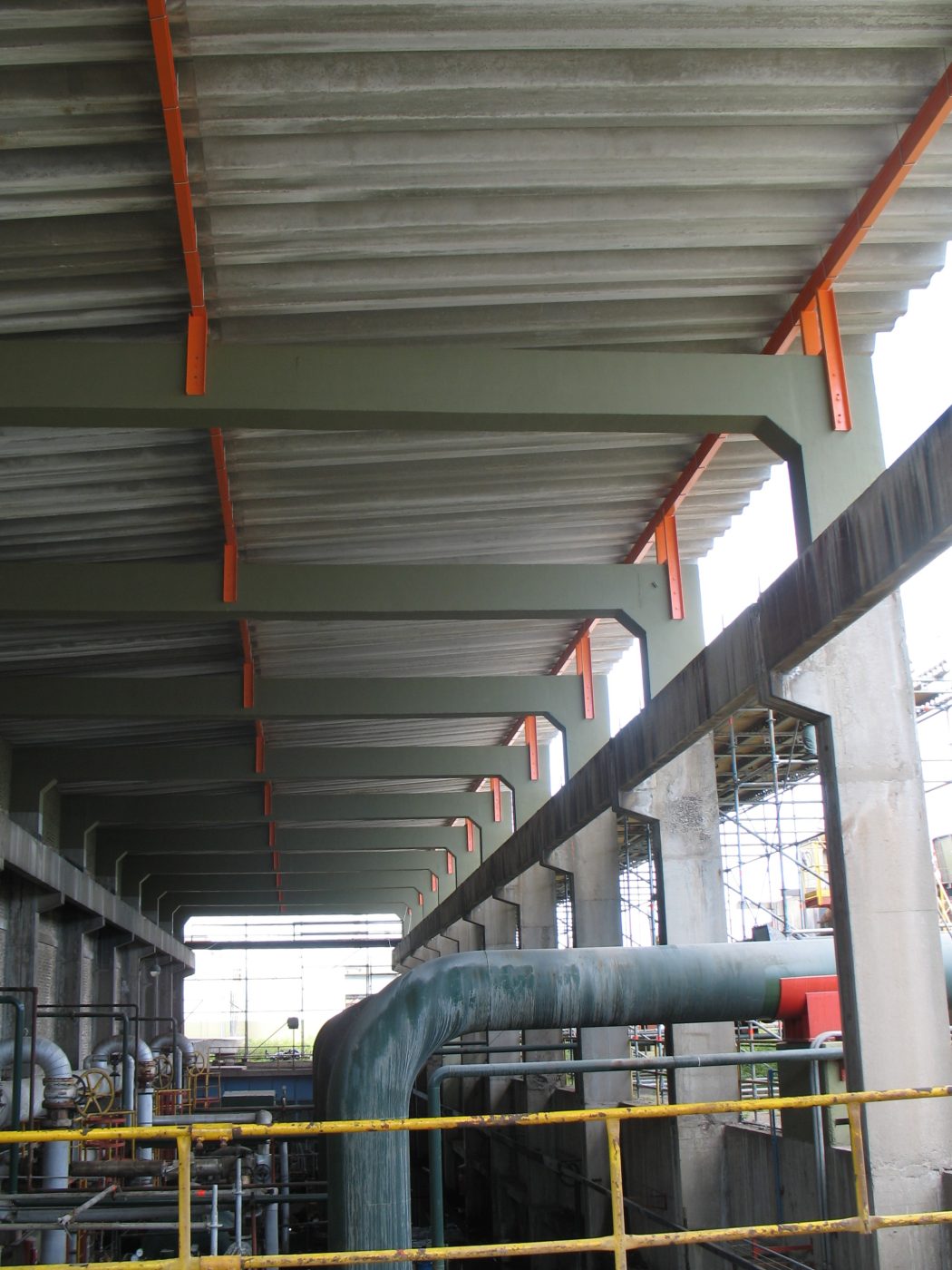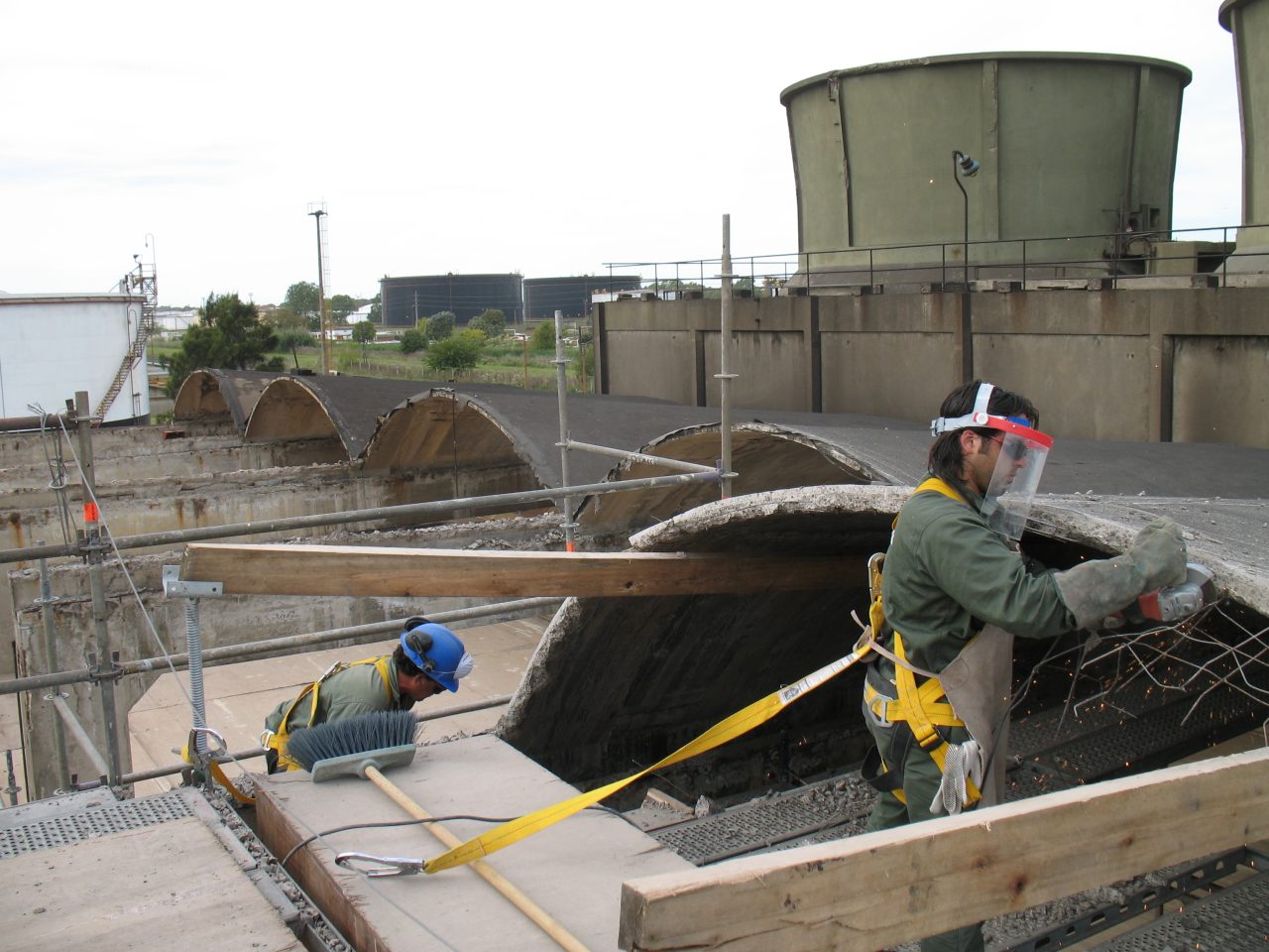 Reparación estructural de las dos vigas carrileras de HªAº de 70 m de longitud, sección 40 cm x 90 cm en Torres Hammon II en Refinería La Plata. Estas vigas se encontraban seriamente deterioradas por las agresiones químicas del ambiente y fueron recuperadas por medio de la reparación y pasivasión de sus armaduras y reconstitución de su sección con materiales especiales de SIKA.