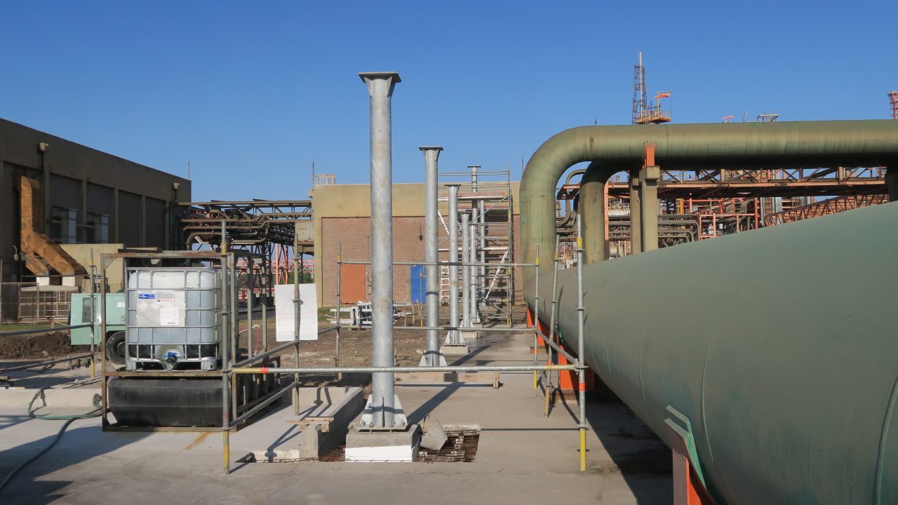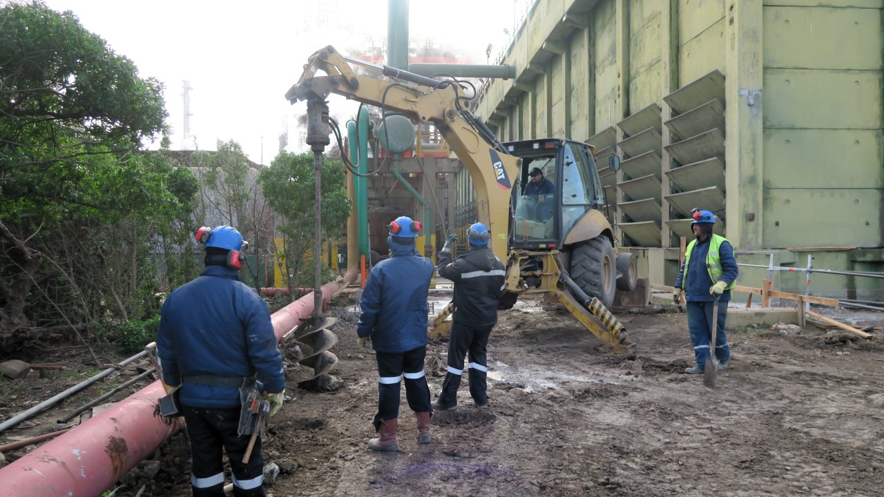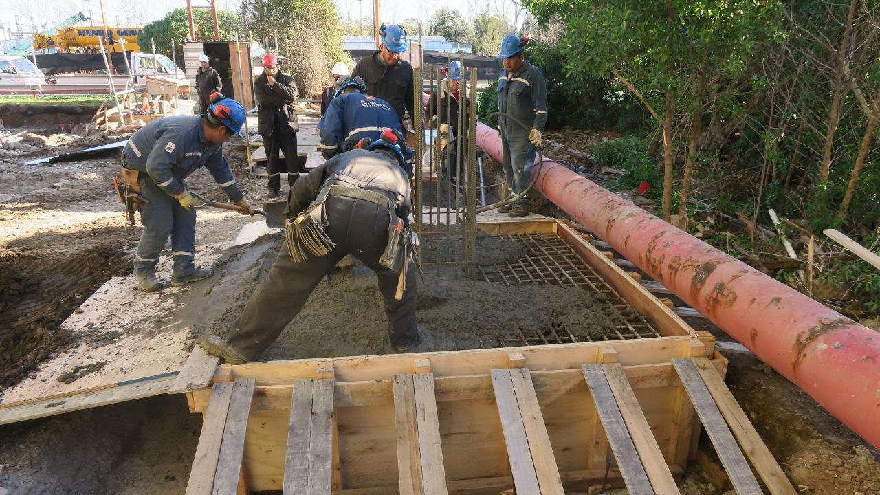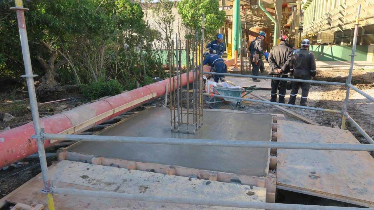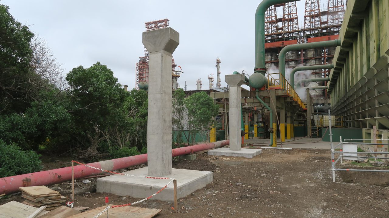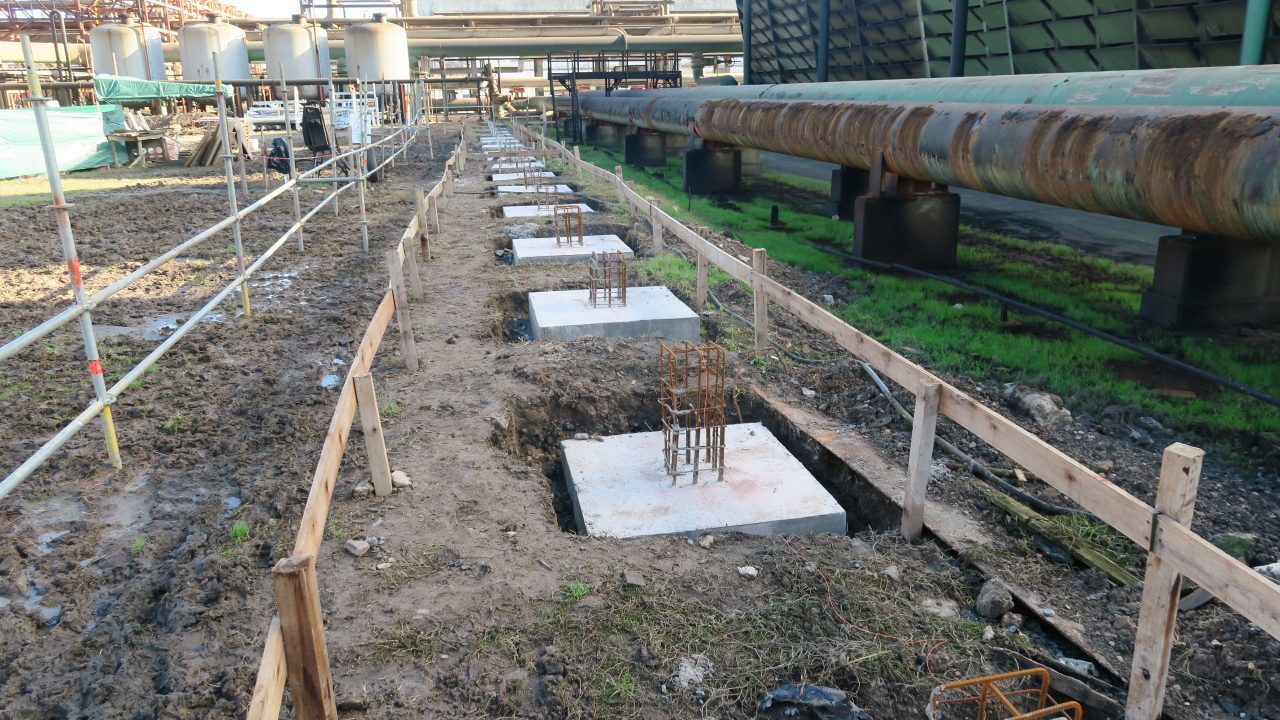 Intervención sobre línea de agua de enfriamiento – Química: Sleepers y bases de fundación para el montaje de estructuras metálicas (1.4 tn cada una) capaz de soportar el paso de una nueva cañería de 36“ hacia la torre de enfriamiento.