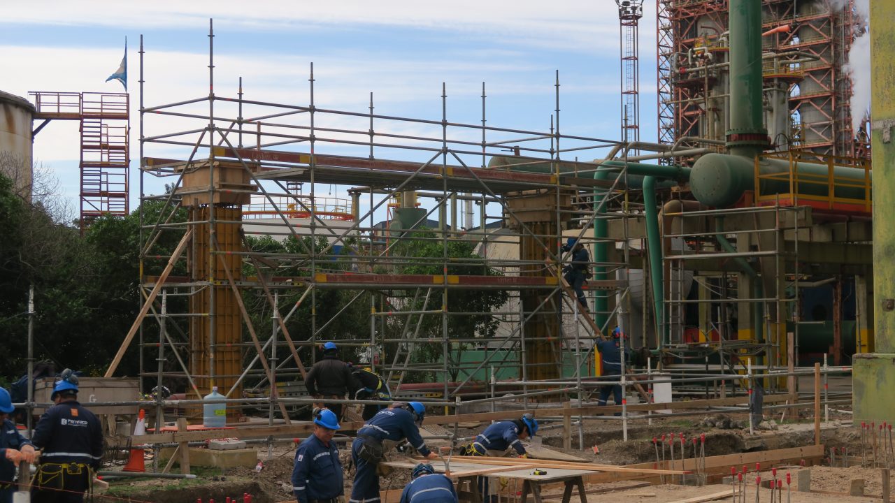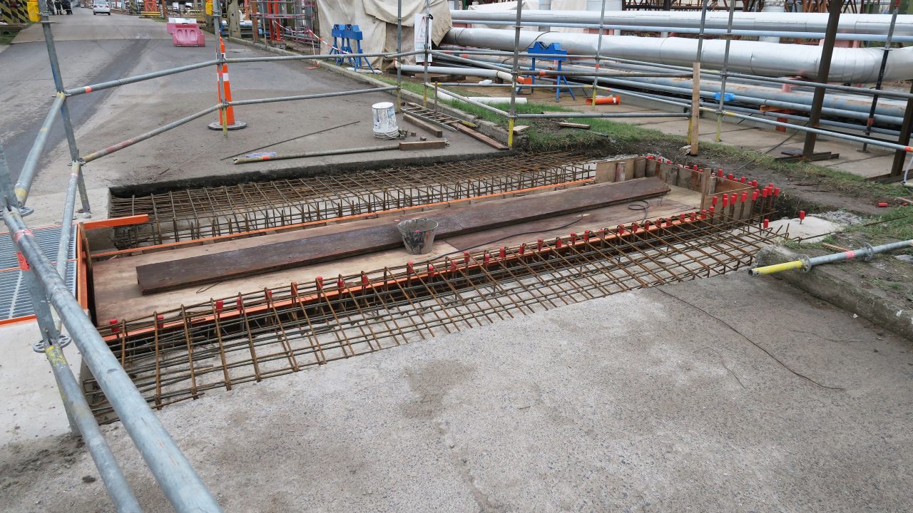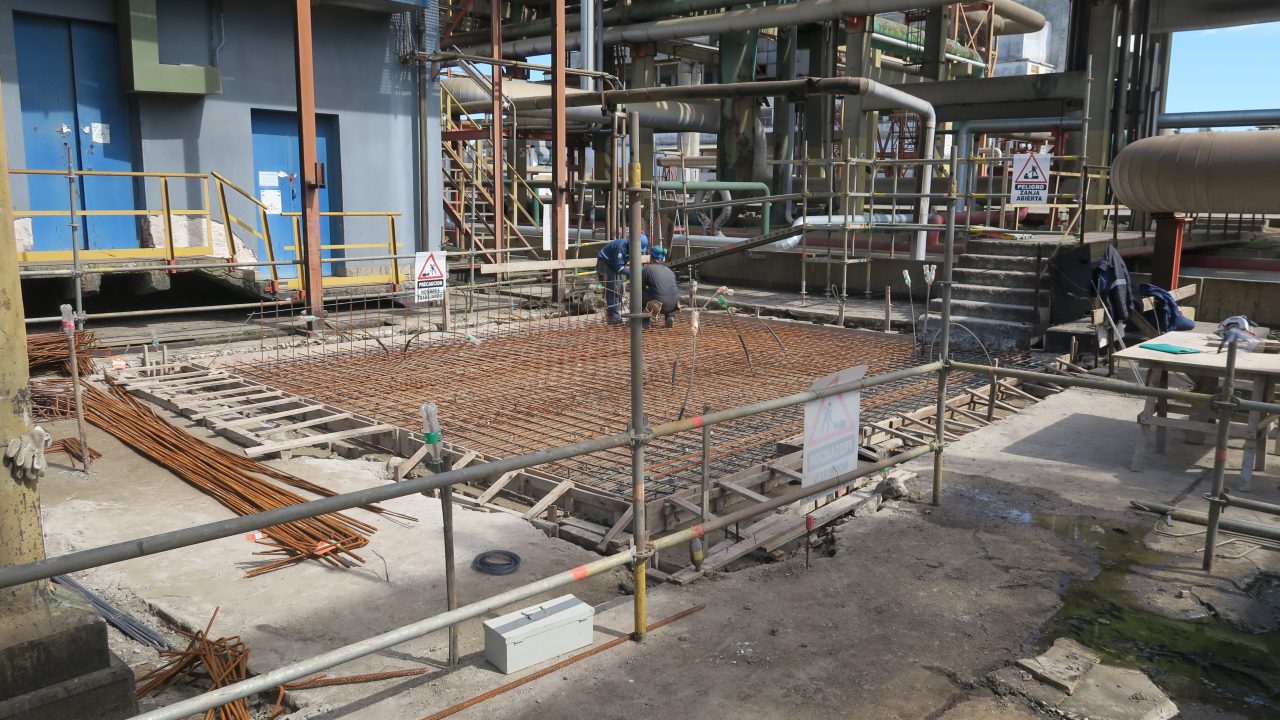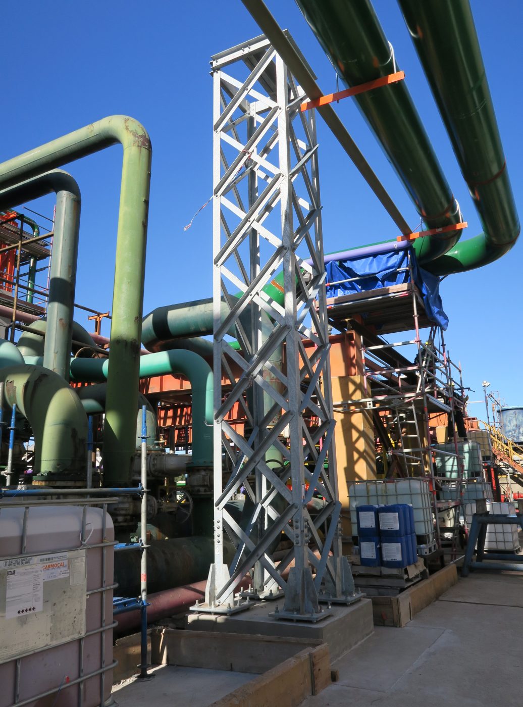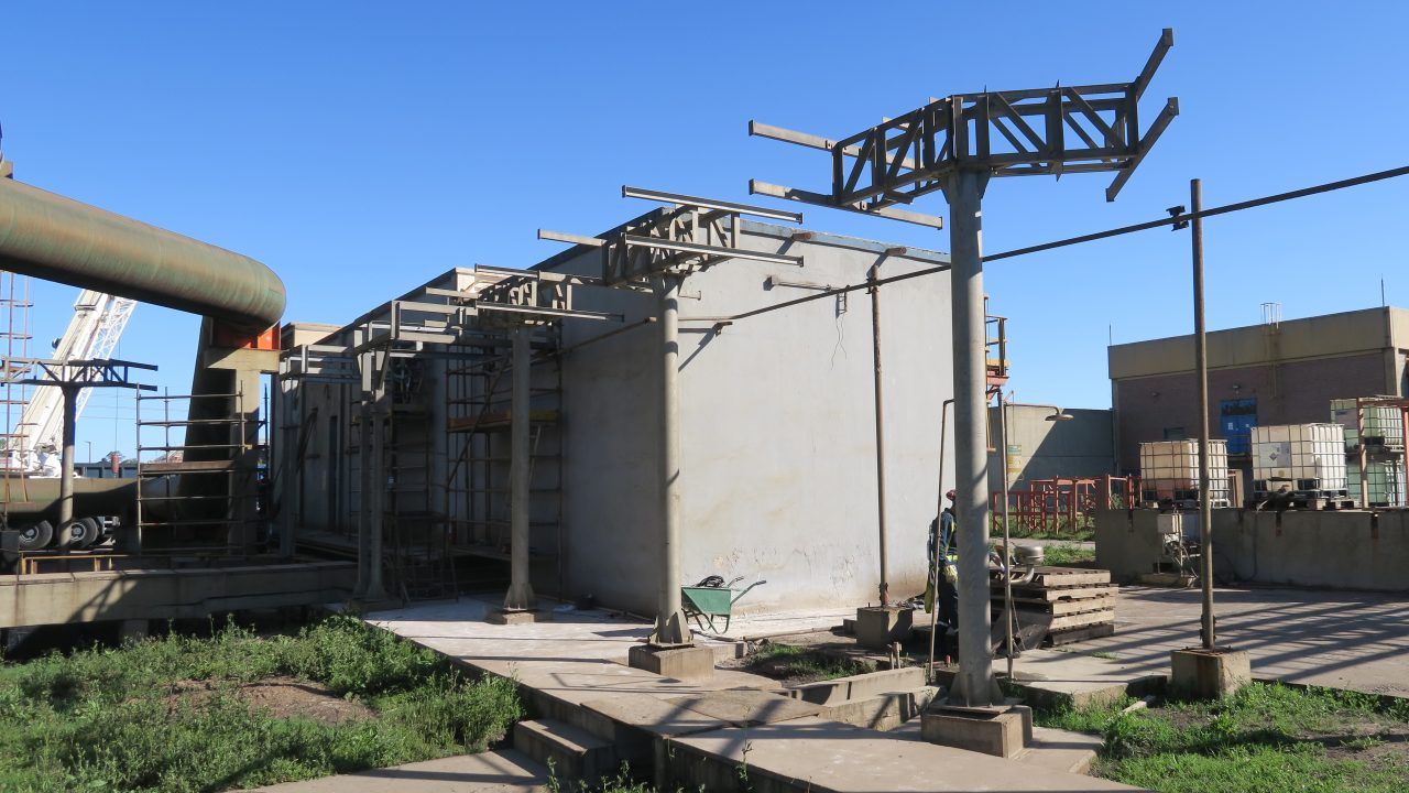 Intervención sobre línea de agua de enfriamiento – Química: Sleepers y bases de fundación para el montaje de estructuras metálicas (1.4 tn cada una) capaz de soportar el paso de una nueva cañería de 36“ hacia la torre de enfriamiento.
